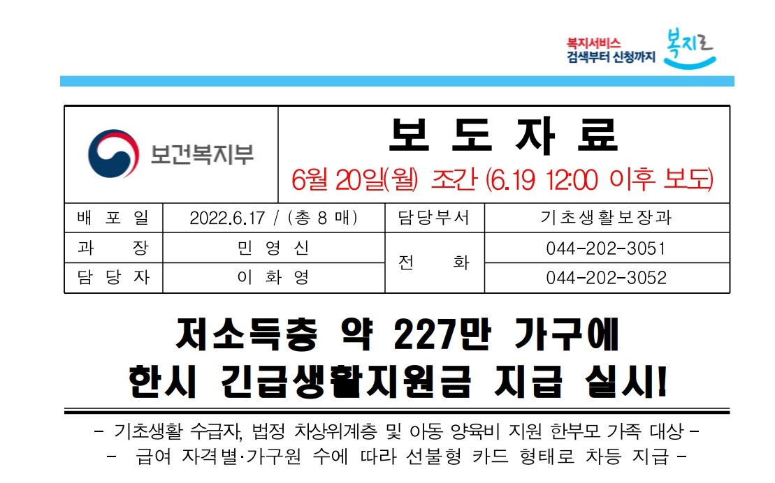 저소득층을 위해 보건복지부가 가구수에 따라 최대 145만 원가량의 한시 긴급 생활지원금을 지급한다고 밝혔습니다. 급격한 물가상승으로 인해 생계와 소비에 대한 부담을 줄여주기 위한 지원금입니다.