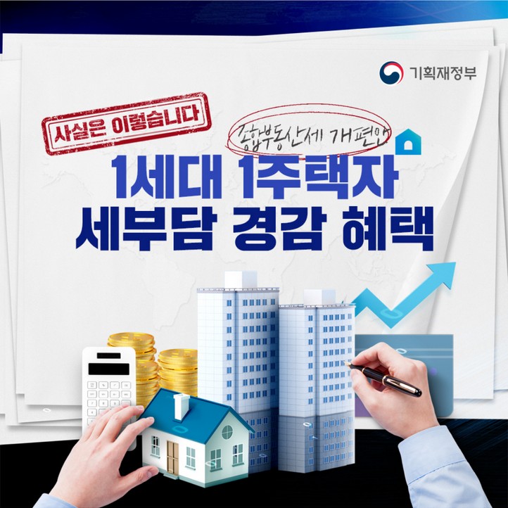 정부의 종합부동산세 개편안 내용 중에서 많은 분들이 관심 있어 하는 1세대 1 주택자의 세부담 경감 혜택에 대해 알아보겠습니다.