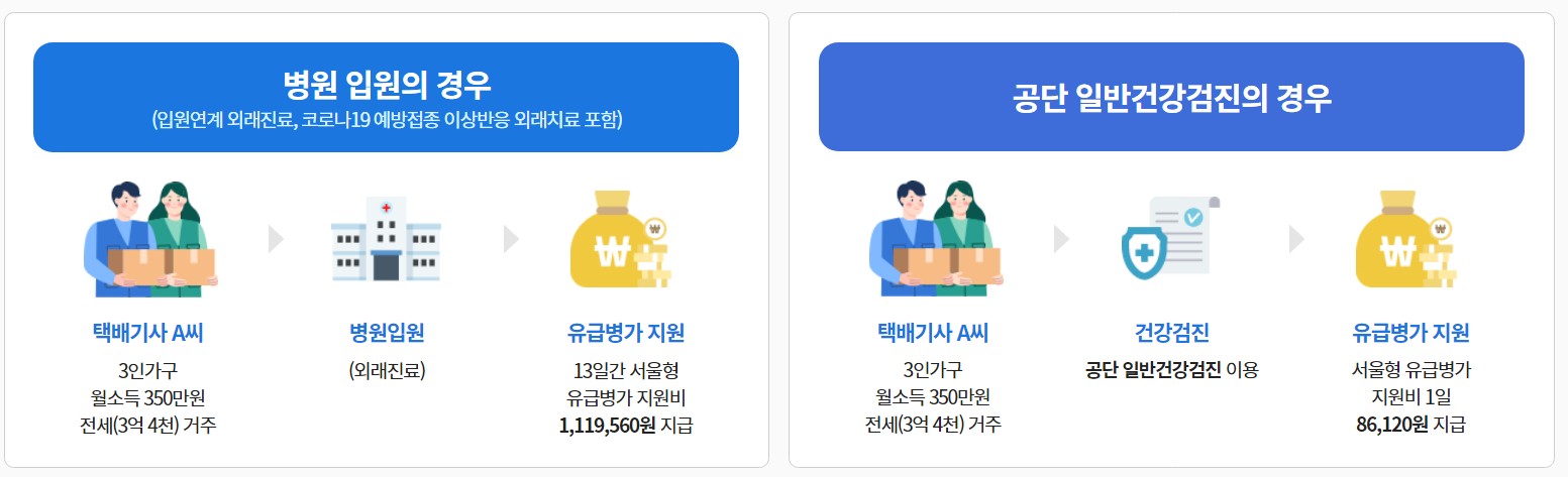 질병·부상의 치료가 필요한 일용근로자, 특고·프리랜서와 같은 노동취약계층에게 입원·입원연계외래진료·공단 일반건강검진 기간에 생활임금을 지원하는 제도입니다.
