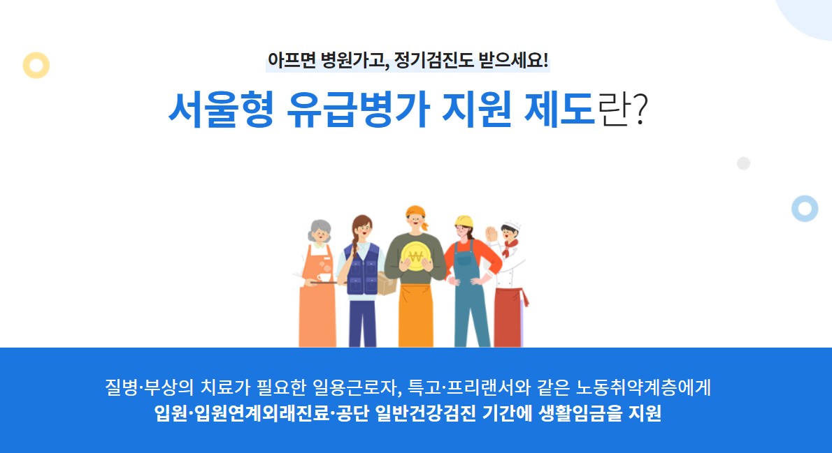 서울시에서 생계를 위해 일하는 취약노동자들이 치료에 힘쓸 수 있도록 지원해주는 정책인 '서울형 유급병가 지원'을 시행합니다. 유급휴가가 없는 일용직 특수형태근로종사자 등이 대상입니다. 병원에서 치료나 검진을 받을 때 생계비를 지원하는 것입니다.