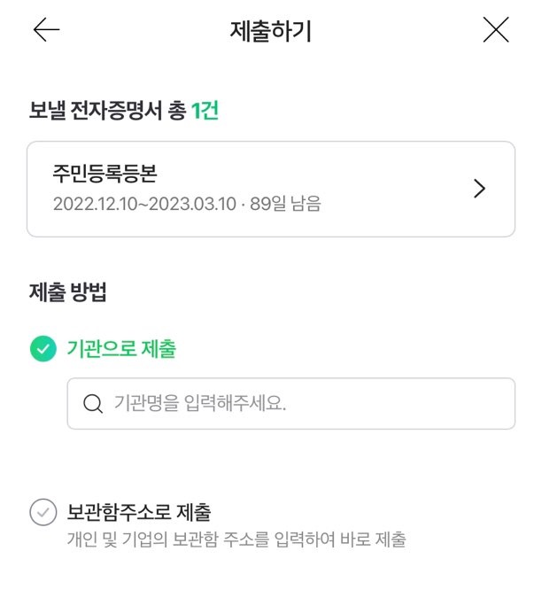 보시면 기관명을 검색해서 제출이 가능하고 본인이 제출하고자 하는 기관이 없으면 보관함 주소를 이용하여 제출할 수 있습니다.