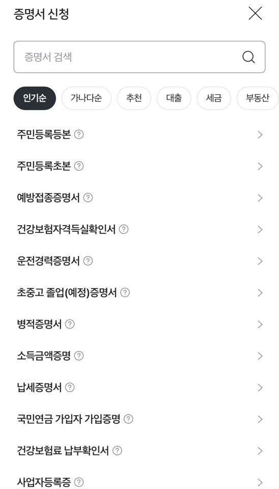기본적으로 증명서가 세팅이 되어있고 +신청하기로 원하는 증명서를 찾을 수 있습니다.