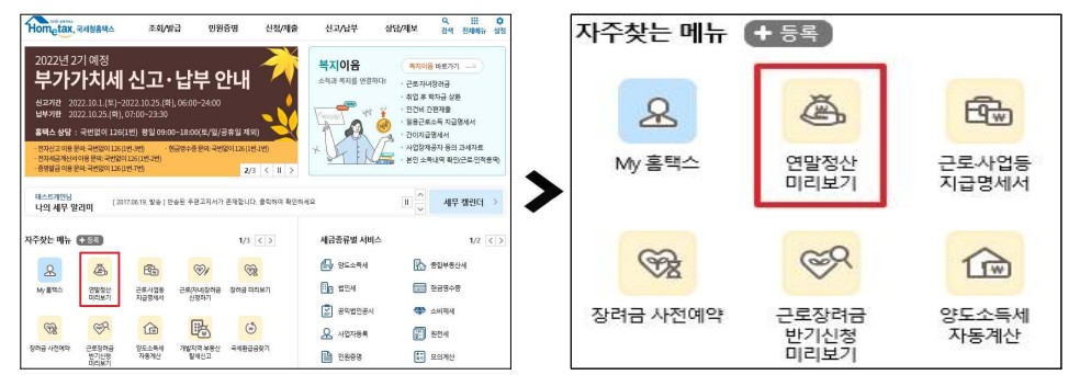 국세청 홈택스 '로그인' 접속 후 ‘조회/발급 → 연말정산 → 연말정산 미리 보기’에서 아래와 같이 이용이 가능합니다.